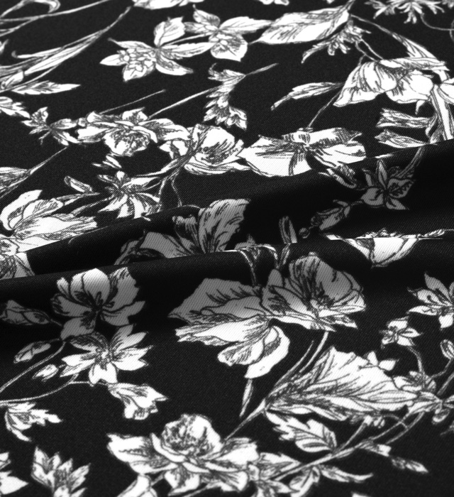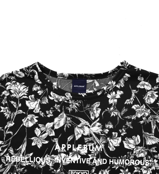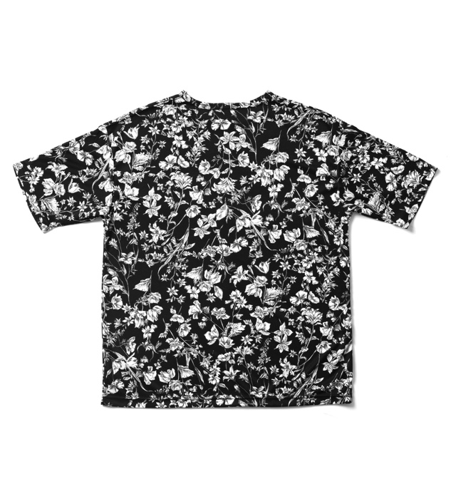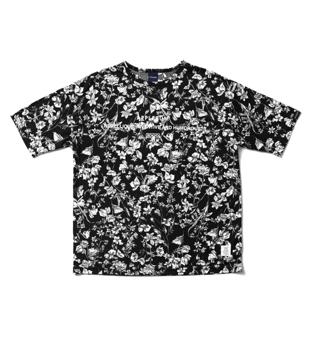 ブラックベースの花柄が派手すぎず上品な印象を与えてくれる1枚。 胸にはロゴと「REBELLIOUS, INVENTIVE AND HUMOROUS」(反骨と発明とユー モア)、「TOKYO」の文字をプリントしました。 軽い着心地のポリエステル素材を使用し、身幅や着丈にゆとりを持たせたビッ グシルエットパターンを採用。