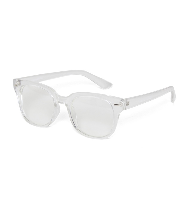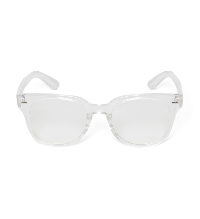 トレンド感のあるクリアフレームに薄めのスモークレンズを組合せたサングラ ス。