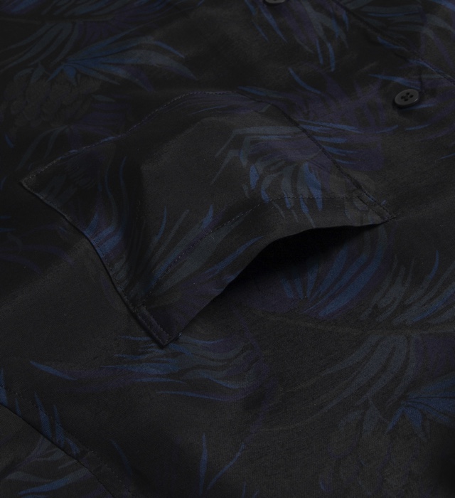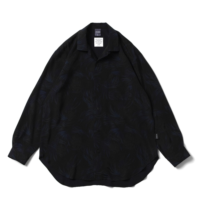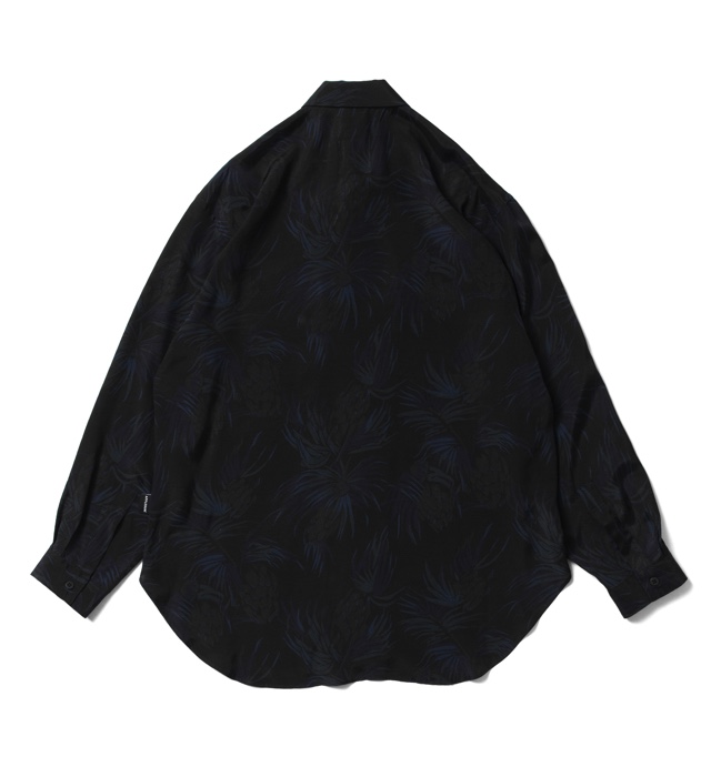 しなやかな肌触りと高級感のある上品な表情が魅力の長袖アロハシャツ。 ブラックベースのボタニカル柄がクールな印象をもたらす1枚。 適度な身幅感でレイヤードしても綺麗なシルエットを保ちます。 襟の付け根にボタンとループを付け、トップまで締めて着用することも可能。