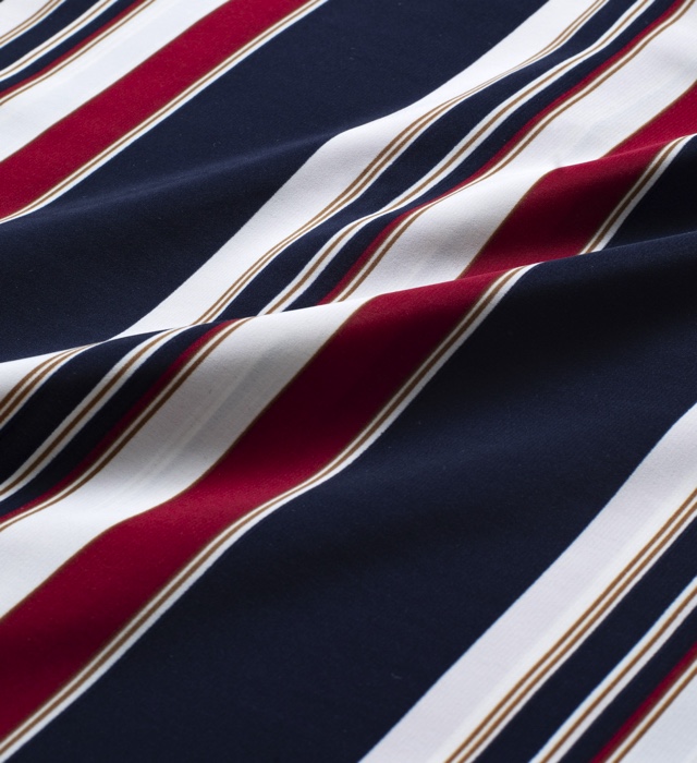 ストライプの幅に変化を持たせユニークな表情が楽しめる半袖シャツ。 やや光沢のある肌触りのよいポリエステル生地を使用しております。 身幅、肩幅、袖口にゆとりを持たせたシルエットとなっており、レイヤードスタイ ルにもおすすめです。