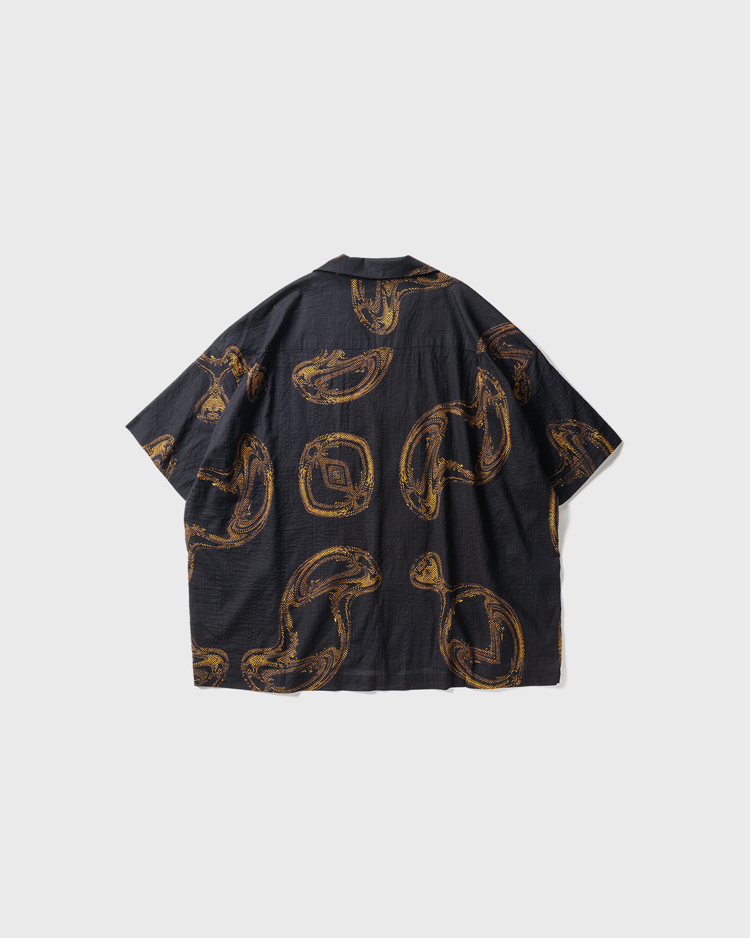 指紋柄のグラフィックを総柄インクジェットプリントした開襟シャツ。