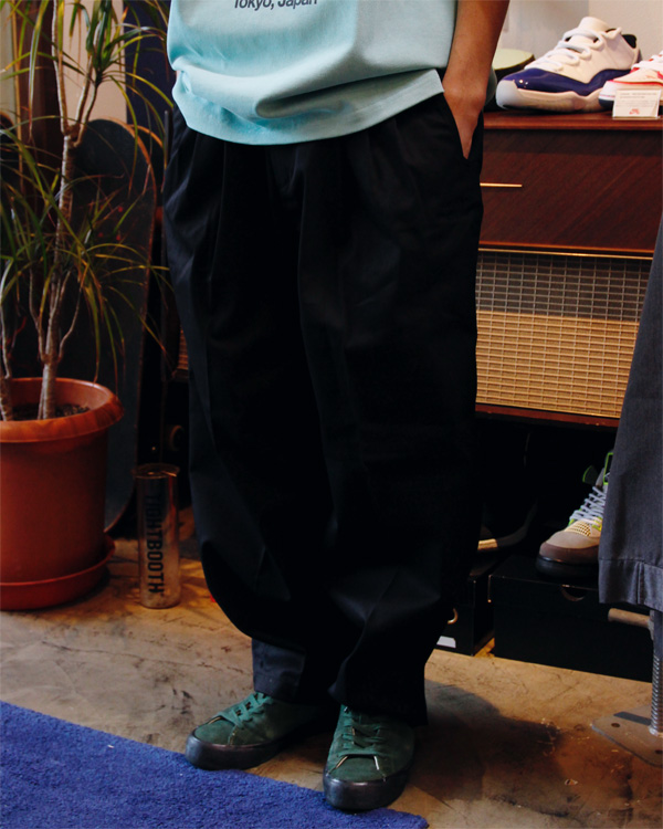 ワイドシルエットのチノパンツ。世にも珍しいスリータック仕様。