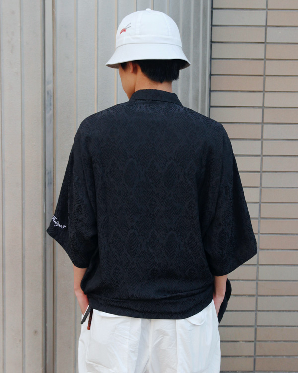 ジャガードサテン素材を使っていて光沢感とドレープ感が最高にイカしてます。