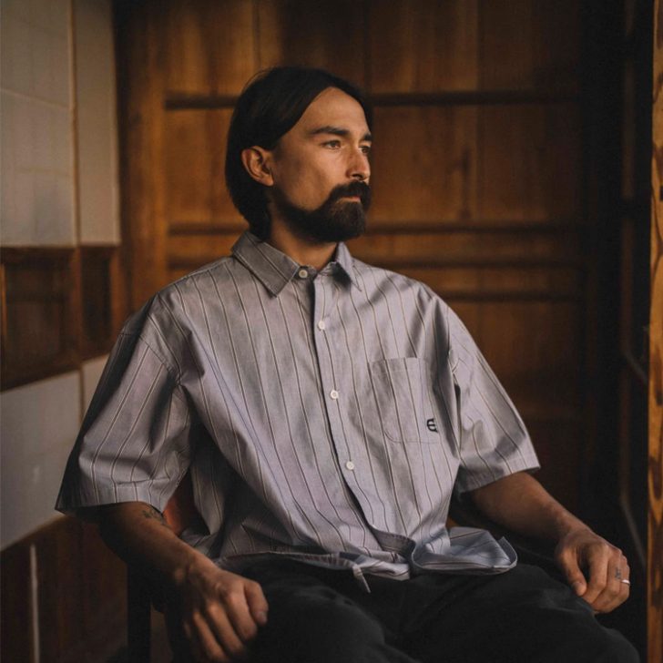 ボタンはロゴ入りのオリジナルデザインを使い、左胸のパッチポケットにはEロゴ刺繍入り。