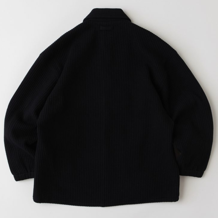 シンプルなフラットボタンがクリーンなアクセントとなり、肉厚な生地感と独特なBIGシルエットが印象的。