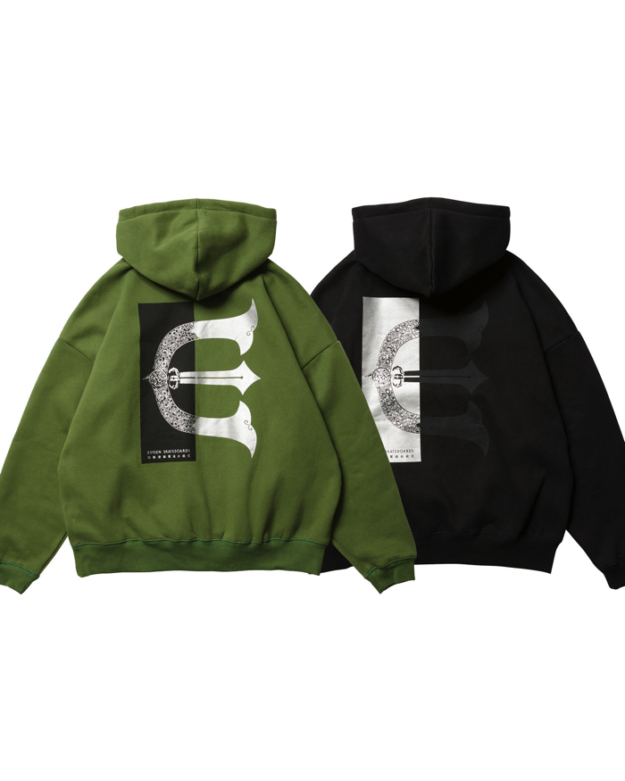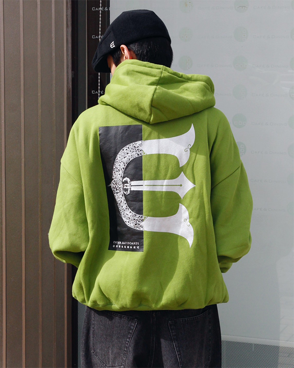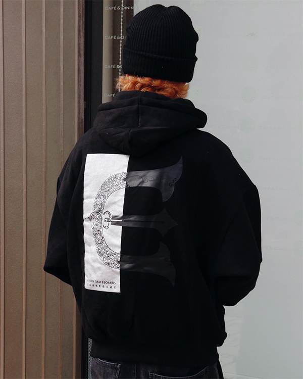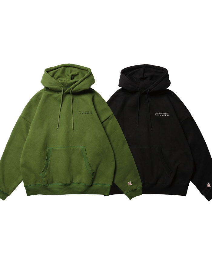 オリジナルボディに進化したフーディ。やわらかな10.5 ozの裏起毛素材を使用した程よくワイドなシルエット。クラシックロゴを左胸に、RECTANGLE LOGOを背中にプリント。カンガルーポケット付きです。左袖口付近に小さなEロゴワッペン付き。