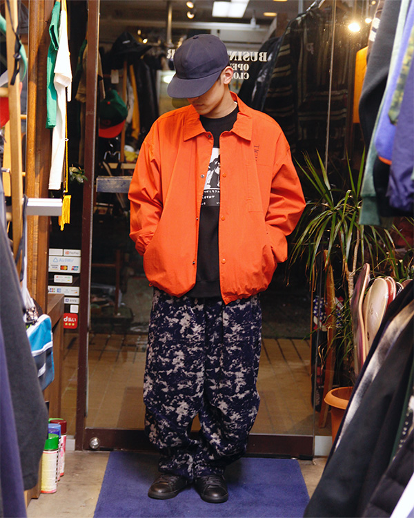 コーチジャケットのオレンジとブリーチコーデュロイパンツのNavyの相性抜群です。