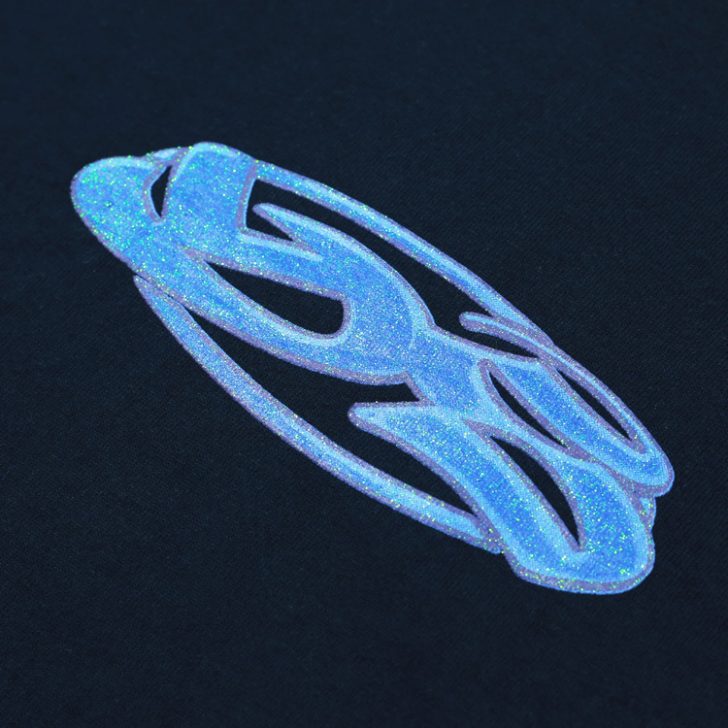 グリッタースクリーンプリントのロゴが入った綿100%のTシャツ。
