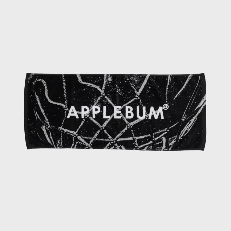 バスケットボールのゴールネットと【APPLEBUM】ロゴを落としこんだスポーツタオル。