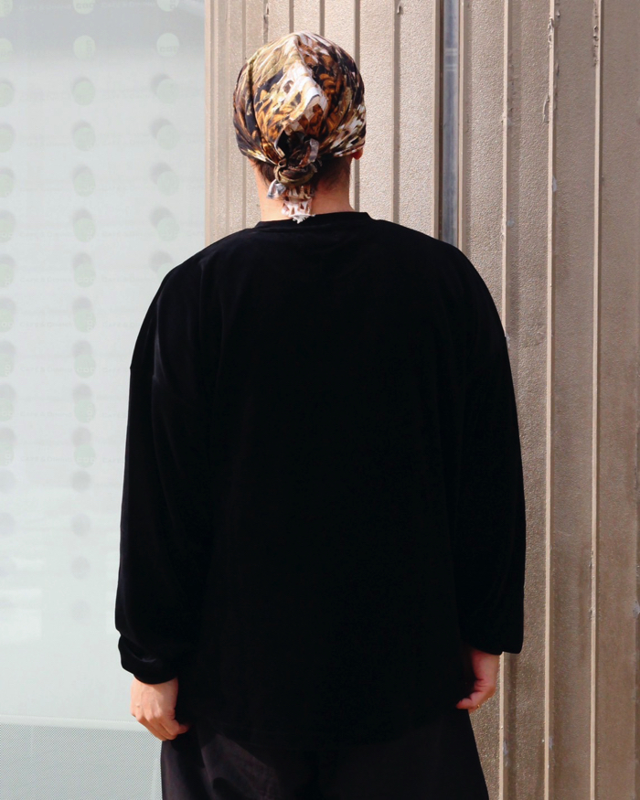 洗いをかけ、程よく柔らかな質感のベロア生地を使用したLSプルオーバートップ。