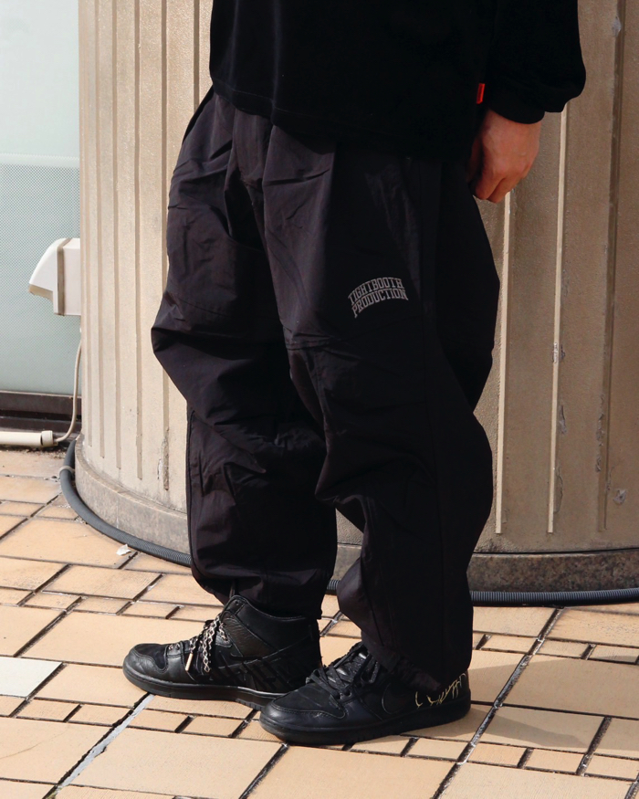 曲線の切り替えデザインが入ったナイロンバルーンパンツ。