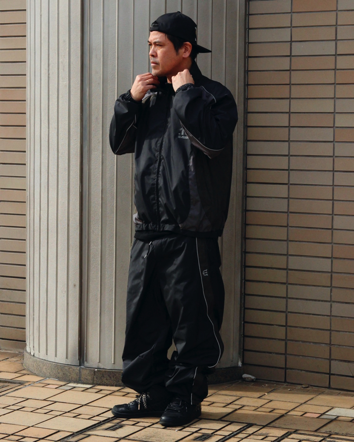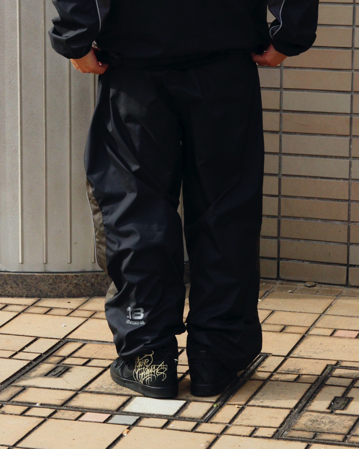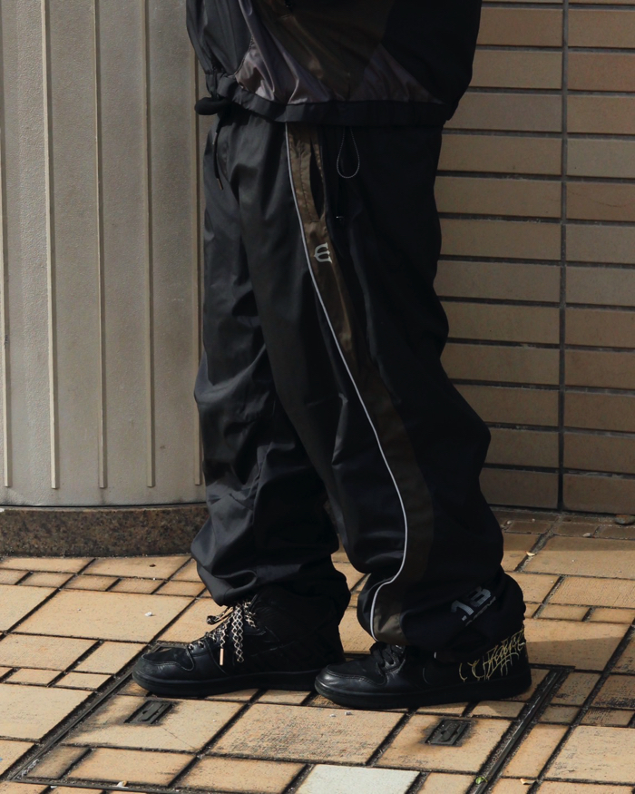 高密度に織られたポリエステルで透湿防水を実現した快適素材のトラックパンツ。