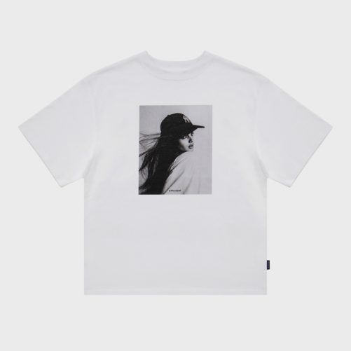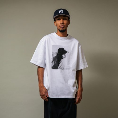 架空の90年代スーパーモデルのモノクロ写真を大胆にプリントしたTシャツ。