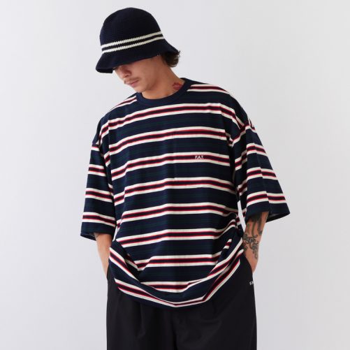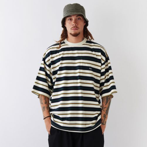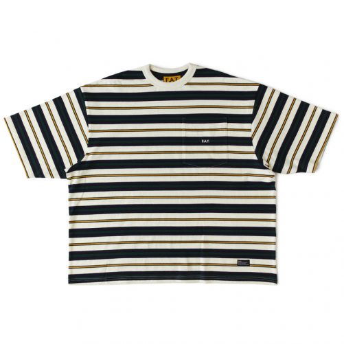 糸からオリジナルで編み上げたボーダー天竺を使用したポケットTシャツ。F.A.T.らしい絶妙なカラーリングが印象的。通常よりも身幅にゆとりをもたせたBIGシルエットは、あわせるボトムスのシルエットを変えることで、様々なコーディネートが楽しめるアイテム。ポケットの刺繍や裾のブランドネームが程よいアクセントに。