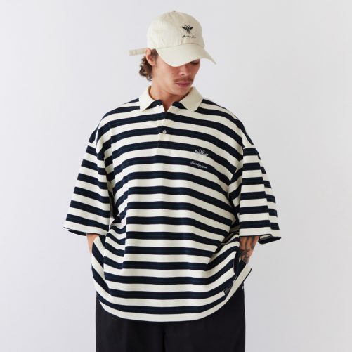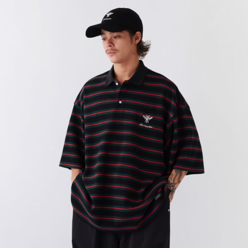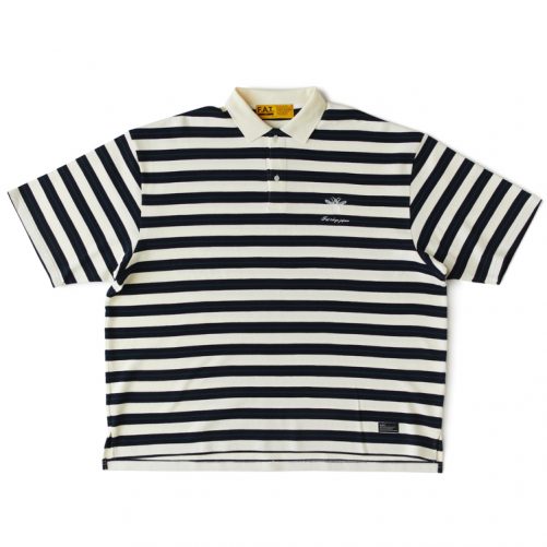 糸からオリジナルで編み上げたボーダーカノコを使用したポロシャツ。F.A.T.らしい絶妙なカラーリングが印象的。通常よりも身幅にゆとりをもたせたBIGシルエットは、あわせるボトムスのシルエットを変えることで、様々なコーディネートが楽しめるアイテム。胸刺繍と裾のブランドネームもさり気なく主張してくれる。