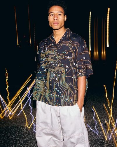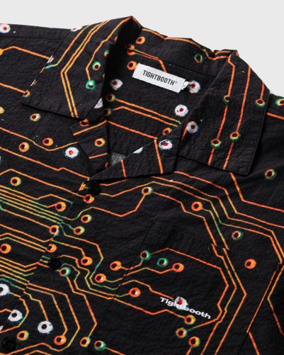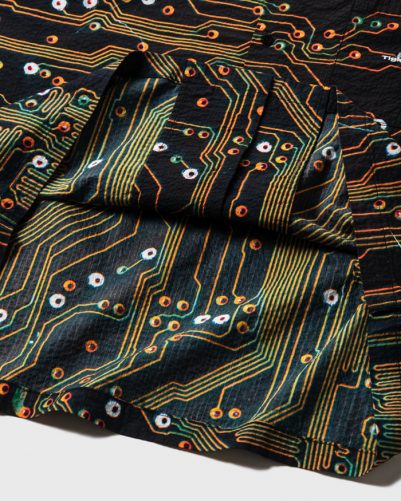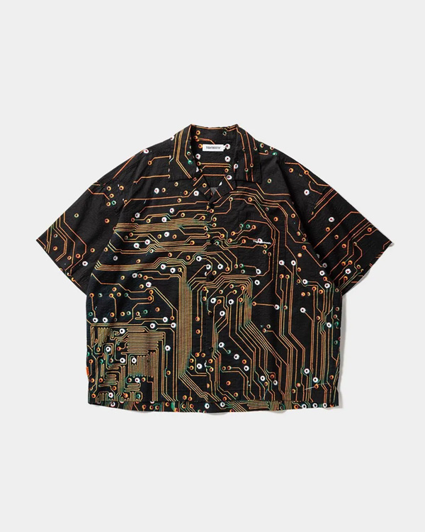 半導体をイメージしたオリジナルグラフィックを総柄プリントした開襟シャツ。