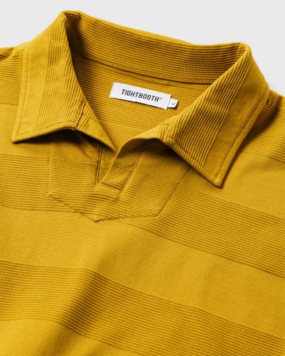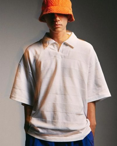 編みでボーダーを表現した生地を使用した開襟ポロシャツ。