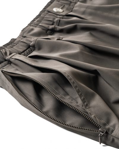 フロントにスラッシュポケット、サイドにはシームに沿ったファスナー付きシームポケット、バックには隠しマグネットボタン仕様のポケットを搭載。