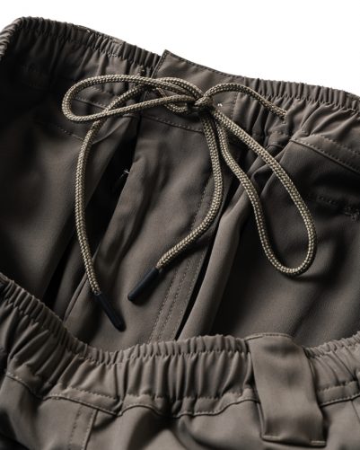 ベルトループも付いたゴム入りのウエストバンドには、内出しのスピンドルコード付き。