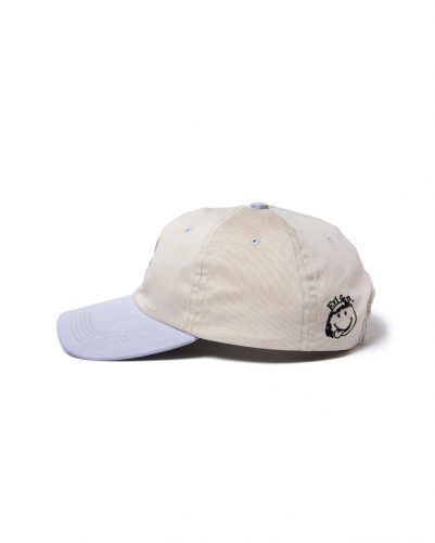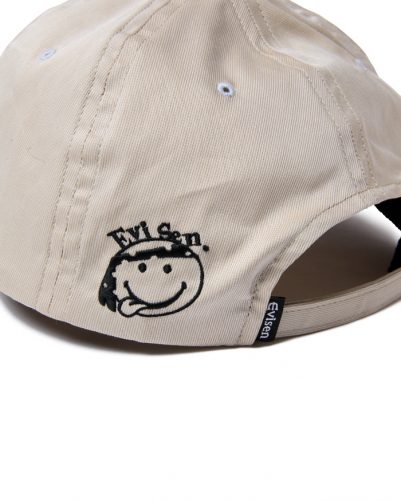 フロントの歪んだEロゴと、サイドパネルの曲が ったニコちゃん刺繍がポイント。