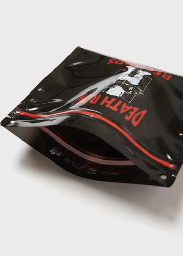 1990年代ウエストコースト・ヒップホップの象徴的レーベル、Death Row Records(デス・ロウ・レコード)のロゴを全面に大胆にプリントしたパケ。