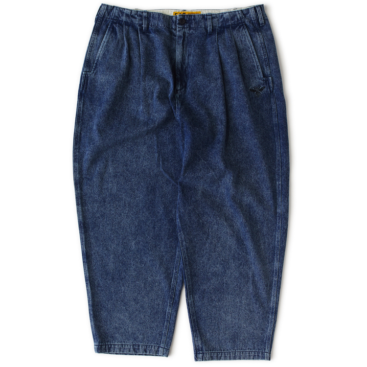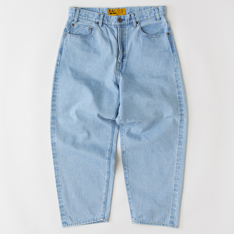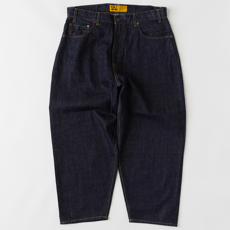 F.A.T.のこだわりが詰まったオリジナルデニム“247”をベースに、ヒップまわりから裾にかけてボリュームをもたせることで、よりワイドシルエットを実現した5ポケットパンツ。