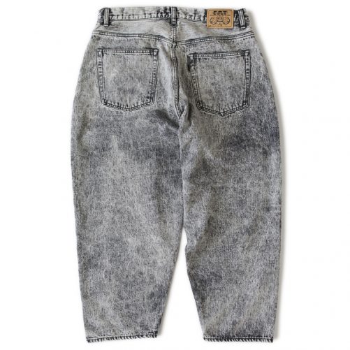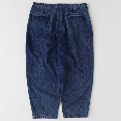 ケミカルウォッシュによる絶妙な色合いとアタリ感が印象的なデニムワイドパンツ。