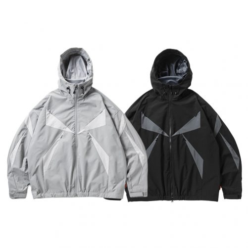 トライアングルの切り替えデザインを施したフード付きジャケット。