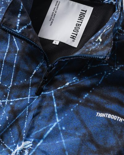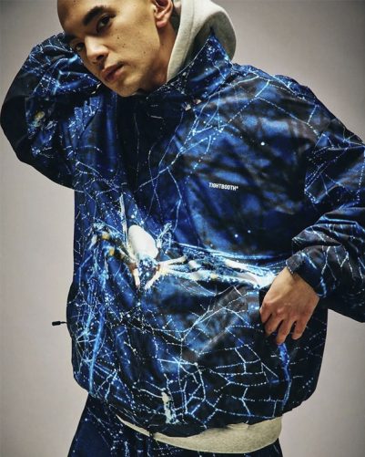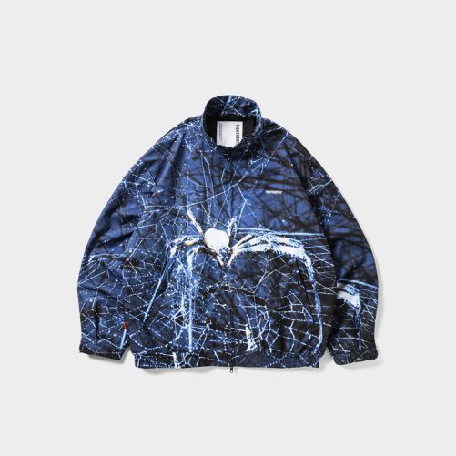 蜘蛛の写真を全面に昇華転写プリントしたスタンドカラーのトラックジャケット。
