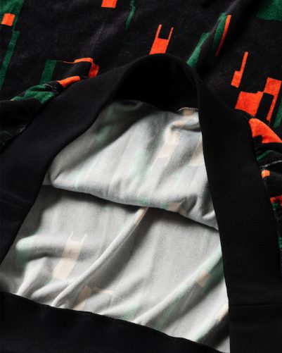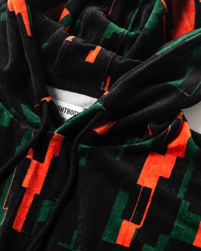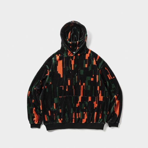 定番のベロア生地に総柄プリントした、ワイドシルエットのプルオーバーフーディ。