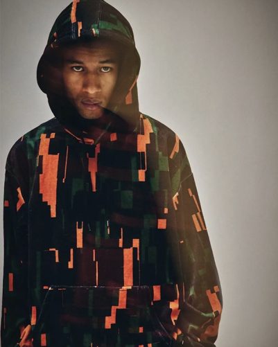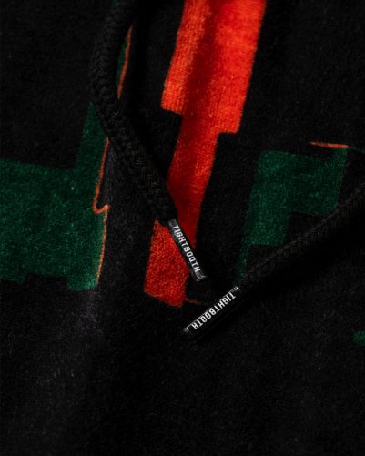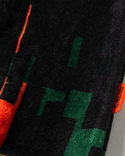 スケートビデオカメラの名機「SONY DCR-VX1000」の使用中、稀に現れるノイズがモチーフの定番のベロア生地に総柄プリントされたプルオーバーフーディやCAP類がどっさりと新入荷。