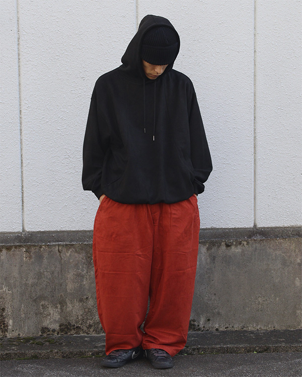 SUEDE HOODIEがBlack、SUEDE BAGGY PANTSはOrangeを。