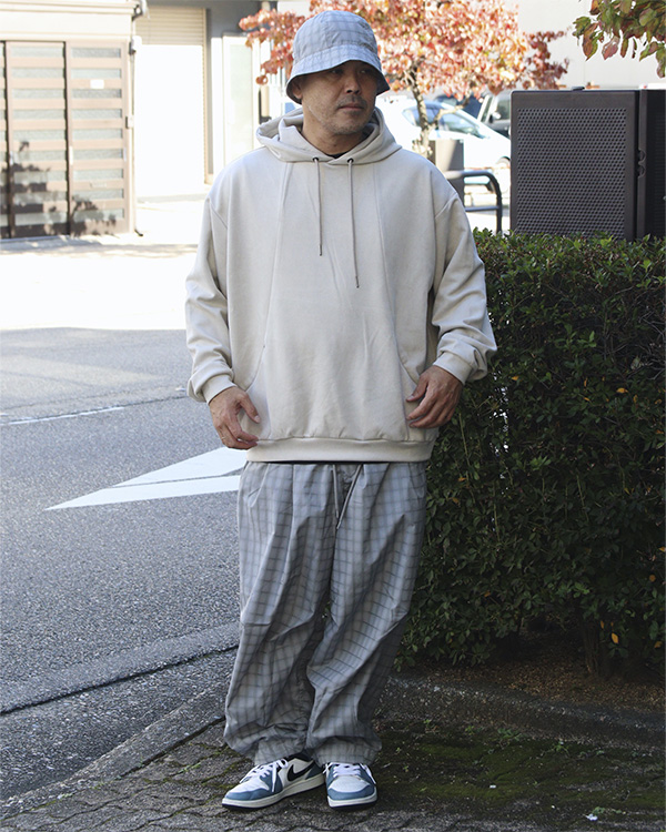 SUEDE HOODIEがGreige、パンツには先月発売のPLAID LIGHT BALLOON PANTSのGreyを。
