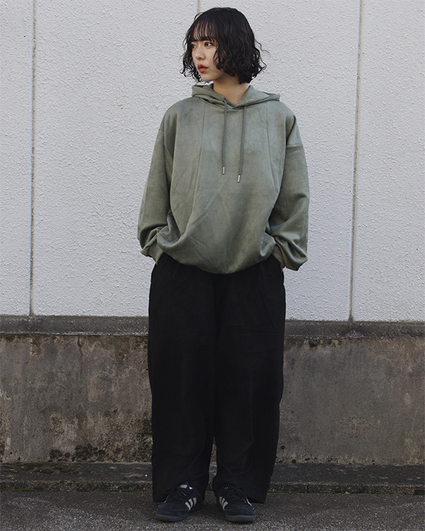 SUEDE HOODIEがSage、SUEDE BAGGY PANTSはBlackを。