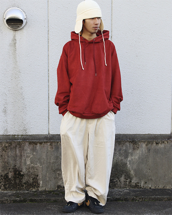 SUEDE HOODIEがRed、SUEDE BAGGY PANTSはIvoryで。