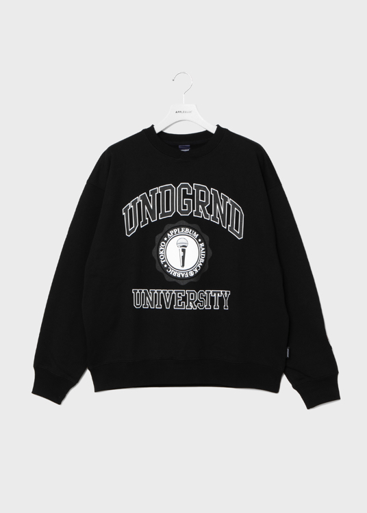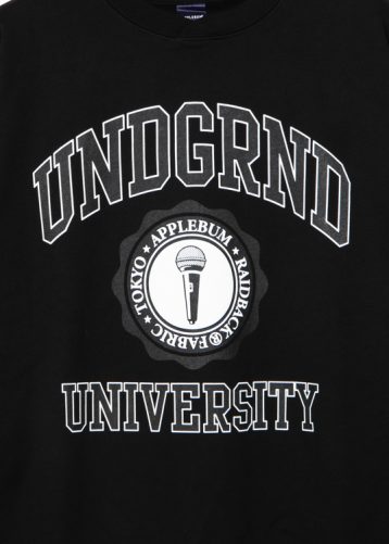 APPLEBUM × raidback fabricによるコラボレーションクルースウェット。 90年代ストリートに根付く「UNDERGROUNDこそすべて」という精神を、カレッジロゴモチーフデザインで再構築した一枚です。