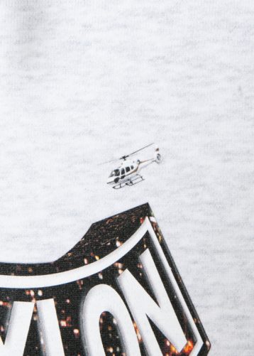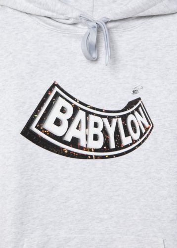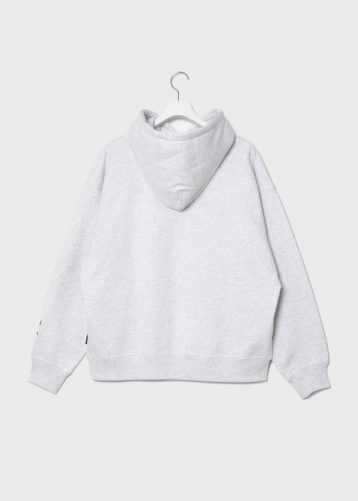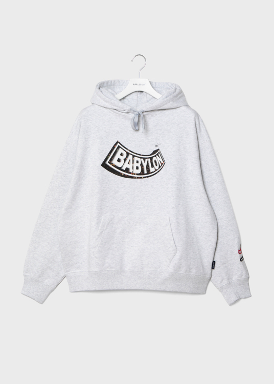 APPLEBUM × raidback fabricによるコラボレーションパーカー。 raidback fabricの人気デザイン「変形アーチロゴ」をベースに、APPLEBUMのマスターピースである“BABYLON VIEW”の夜景グラフィックを融合した共作グラフィックを落とし込みました。