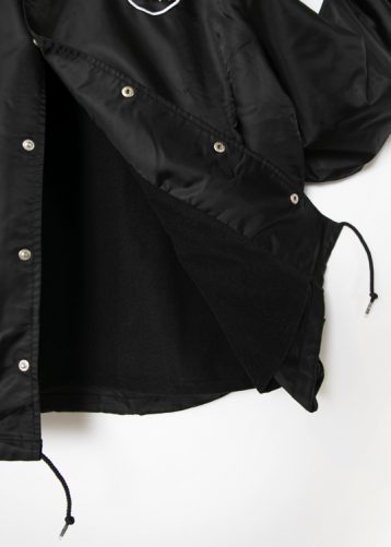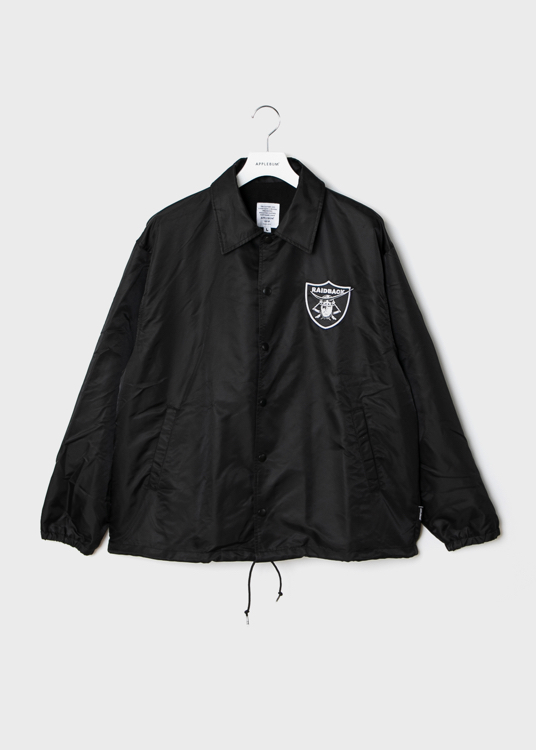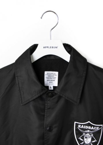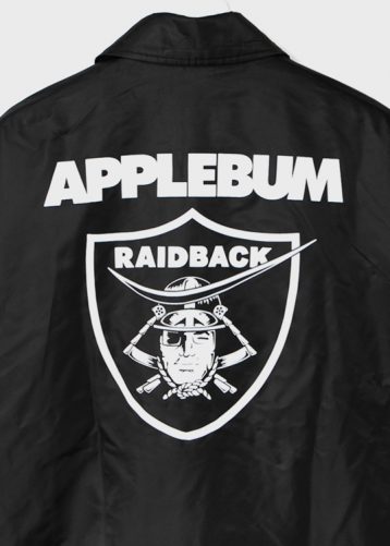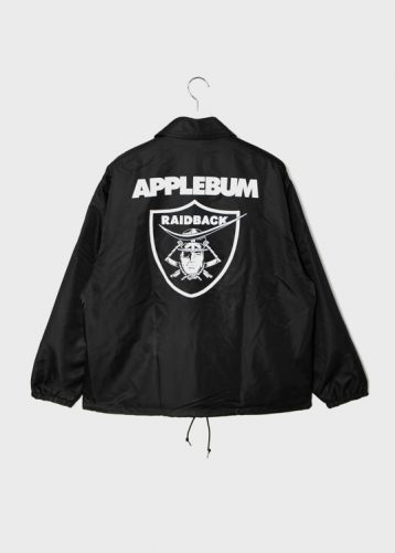 APPLEBUM × raidback fabricによるコラボレーションコーチジャケット。 バックには某チームロゴ(レイ◯ース)を“独眼流”でサンプリングしたグラフィックを採用。
