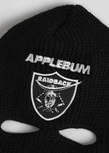 APPLEBUM × raidback fabricによるコラボレーション・バラクラバ。 某チームロゴ(レイ◯ース)を“独眼流”でサンプリングしたグラフィックをワッペンで配置。 柔らかく伸縮性のあるリブニット素材で快適な着用感です。 ビーニーとしても使える2WAY仕様で、ストリートスタイルに存在感を与えるアイテム。