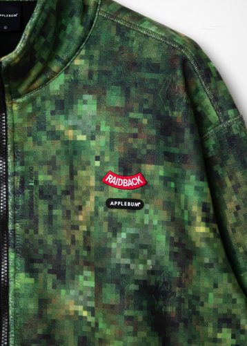 フード部分には両ブランドのロゴをさりげなく配置し、フロントには、raidback fabricのシグネチャーでもあるピクセルカモ柄で「UNDERGROUND」の文字を表現。