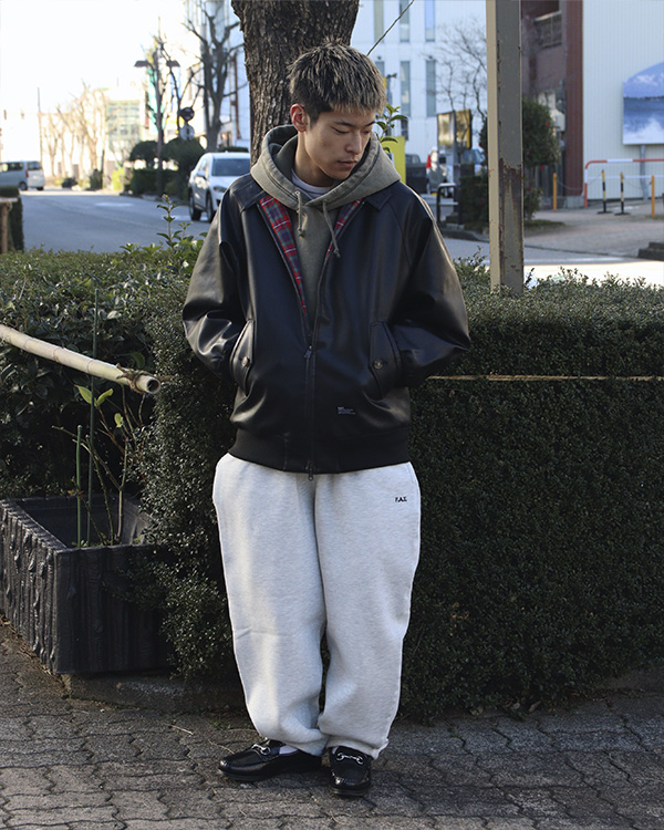 レザーのジャケットにスウェットパンツ、ローファーで綺麗め、尚且つスウェットパンツでラフ感もありかっちりしすぎてないコーデで行ってみました。