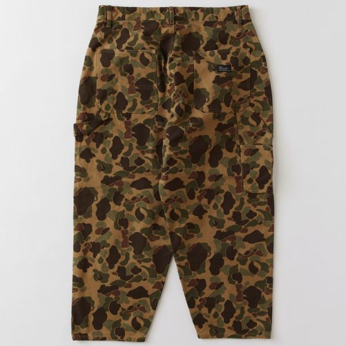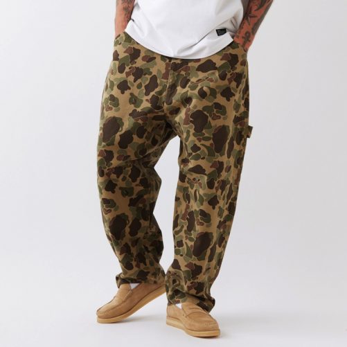 目の詰まった肉厚キャンバス素材を使用したペインターパンツはダックハンタープリントが印象的。ヒップから膝にかけてボリュームを持たせたワイドシルエットに加え、ジャストレングスはどんなスニーカーとも絶妙なバランスで合わせられる。ウォッシュ加工を施すことで適度な柔らかさと動きやすさに仕上げたアイテム。ドローコードを備え、ベルトレスでイージーパンツとして着用可能。バックポケットのブランドネームがさり気なく主張してくれる。