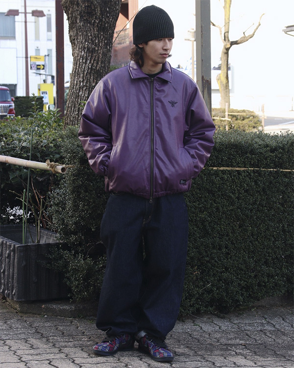 細かなシボ感と柔らかなタッチが特徴の合皮素材を使用したジップブルゾン。