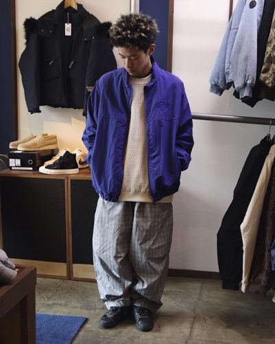 パンツは薄手のナイロンが使われているチェックパンツ。
