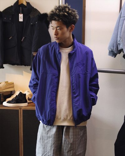 トップスはシンプルで胸にロゴ刺繍が入った薄手のジャケット。