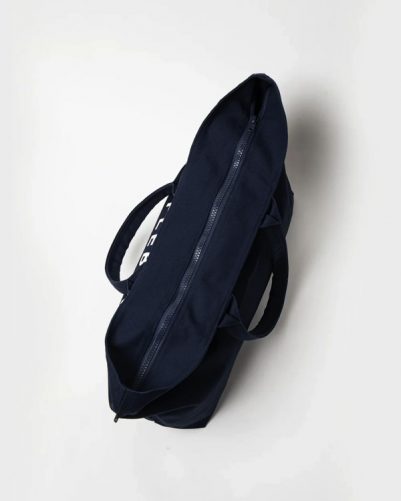 ブランドイメージカラーであるネイビーのバッグに、白色でロゴをプリント。