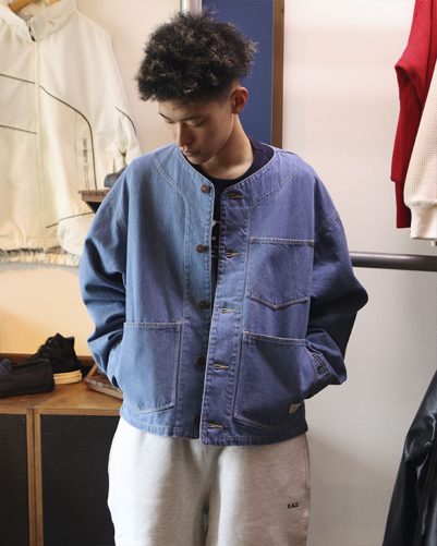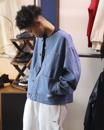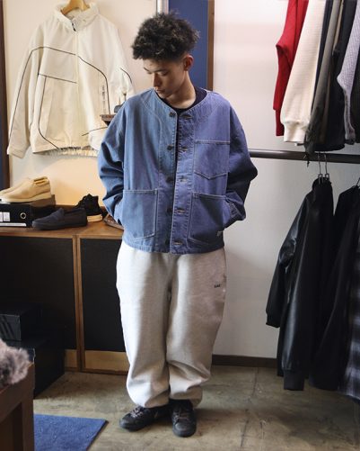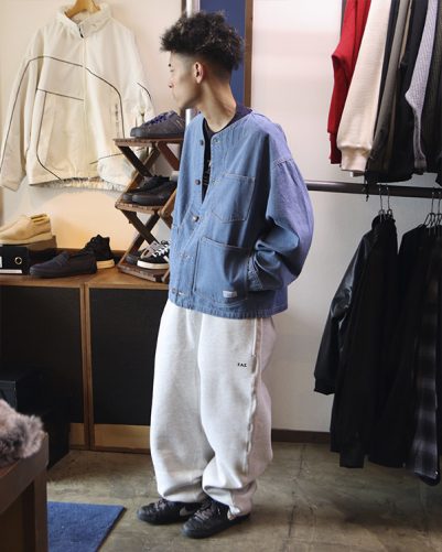 FATのノーカラーのデニムジャケットに、FATのこだわりが詰まったスウェットパンツを合わせてみました。