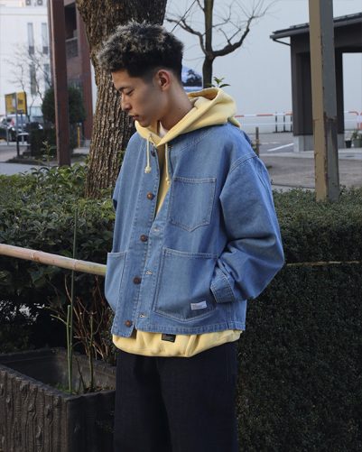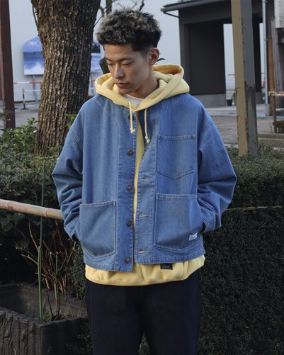 普通の襟のデニムジャケットと違い首元がルーズなので、フーディーを着用しても窮屈にならないのでストレスフリーで着用できます!!