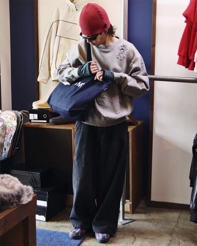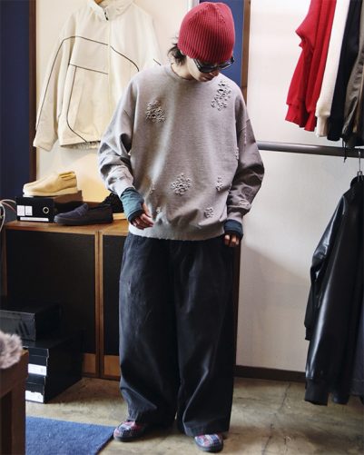 まず、トップスにはTIGHTBOOTHとDELUXEのコラボアイテム “DAMAGE CREW SWEAT”