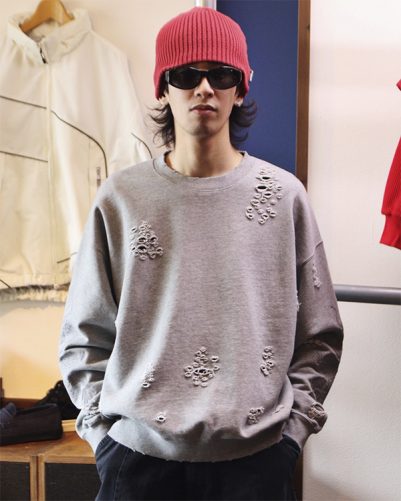 全体にダメージ加工を施したクルーネックスウェット。